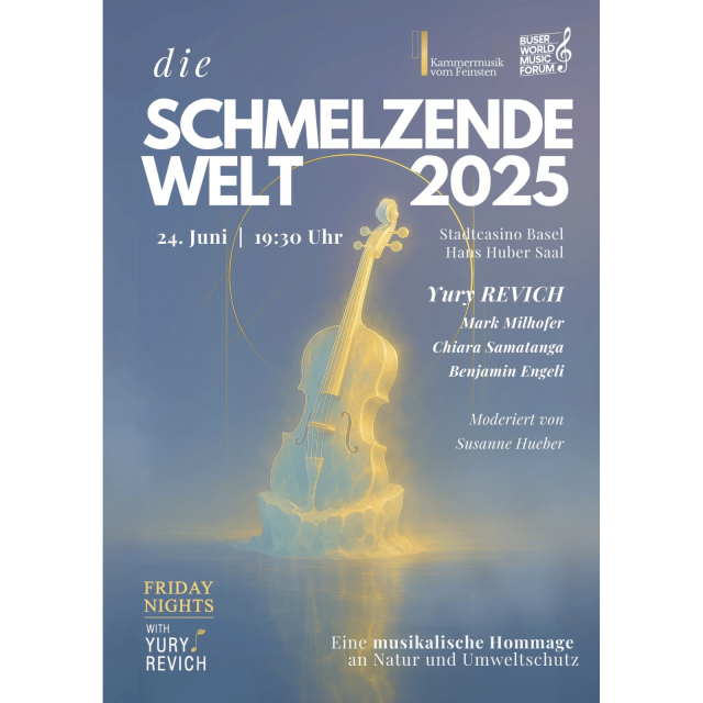 Die Veranstaltung "Die Schmelzende Welt 2025" präsentiert Kammermusik vom Feinsten unter der Leitung von Yury Revich. Nach dem Erfolg im letzten Jahr wird Revich erneut mit seiner internationalen Konzertreihe im Stadtcasino Basel auftreten. Das Programm umfasst eine Auswahl von Werken, die von der Natur inspiriert sind und deren Vielfalt und Harmonie widerspiegeln.